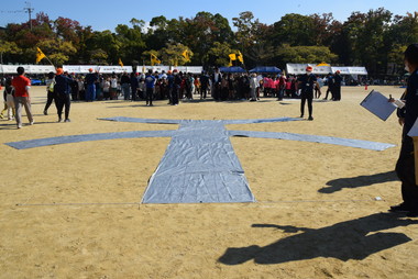 グランドに「白」チーム山側と、「赤」チーム海側に分かれ