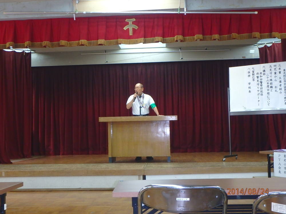 東光小PTA会長の挨拶に始まり講師として 岸和田警察 防犯係り、 大阪府警子ども安全見守りサポーターの講和を聞きました 東光小学校の児童たちからお礼の歌がありボランティアの方々も 元気を頂きました。