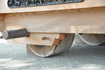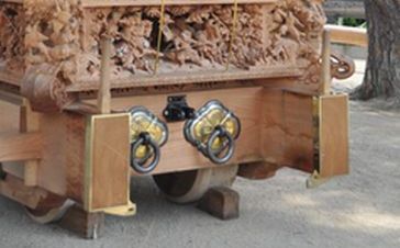 足になる 車で言えばタイヤ部分 「 松の木 」 でできている 下だんじりのコマは 土台の内側にある 曲がるとき 車でたとえれば ドリフト しています コマには ドビ 芯金 セッパ ブレーキのドラム 等で構成されています 足回りは 現在 事故防止のため ブレーキを備えています また その部品には 10年くらい前は新幹線のブレーキに使っているもの とか その後は F1仕様の部品とか オイル(オイルレス)等 常に進化しています